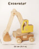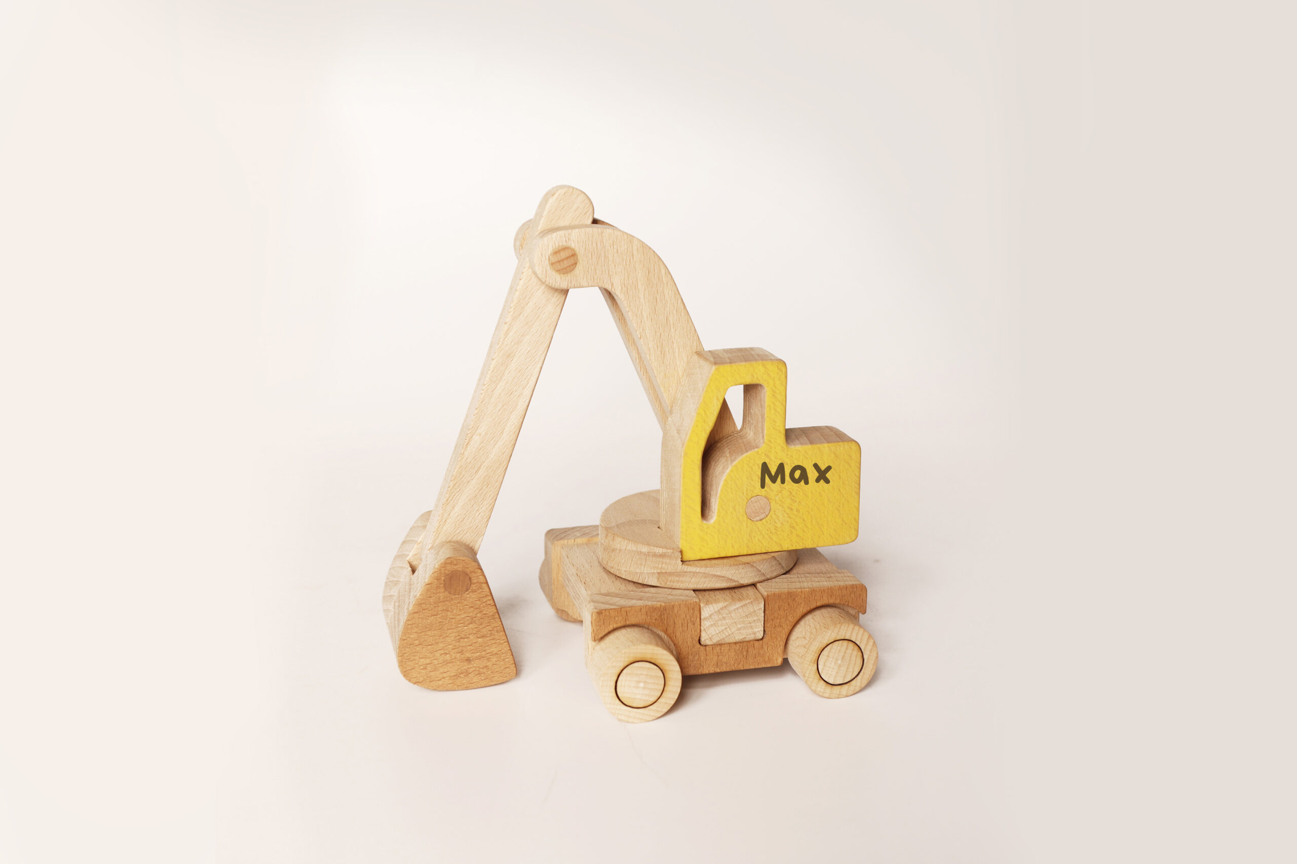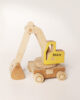 Figura de excavadora de juguete de madera maciza de haya. Parcialmente recubierta con cera de color especialmente desarrollada para juguetes infantiles.