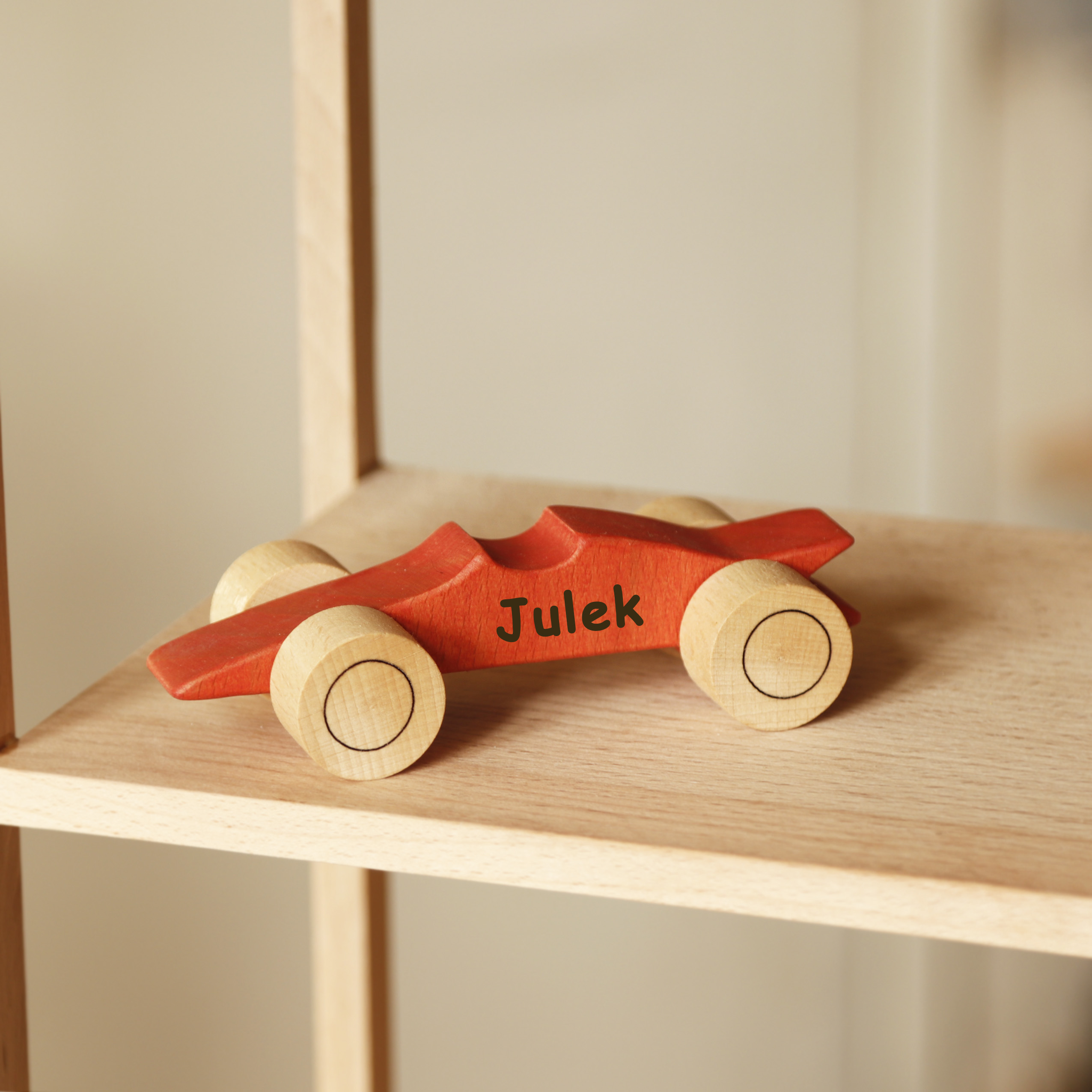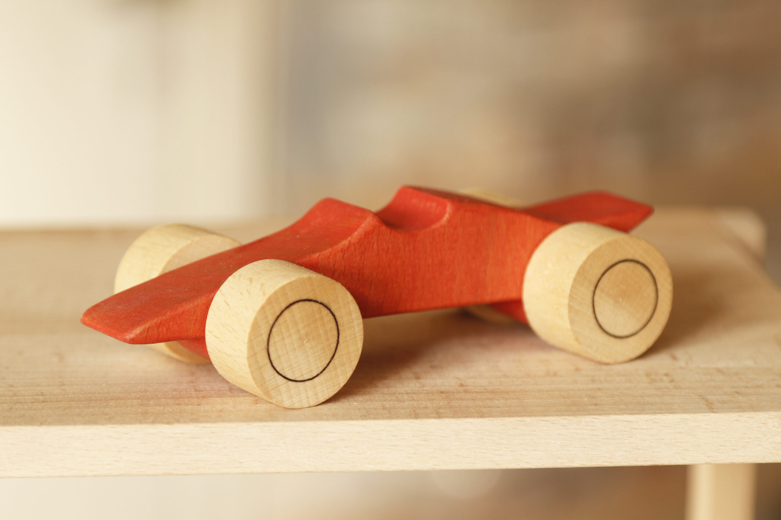 La figura del coche Toy Racing está recubierta con pinturas y ceras a base de agua ecológicas OSMO y Beckers, certificadas EN-71 (seguras para juguetes de niños, resistentes a la saliva y al sudor).