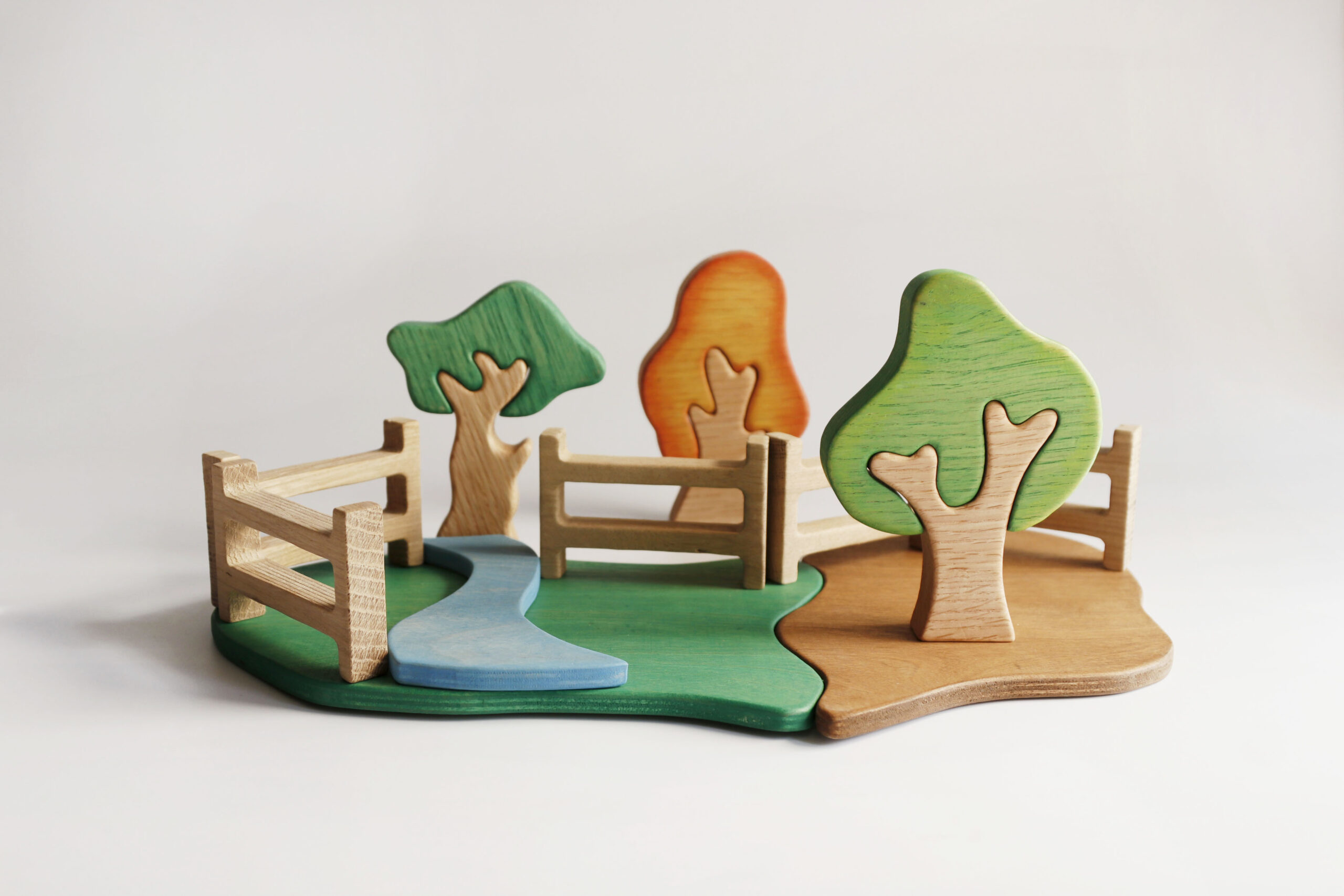 Diseñado para inspirar el juego imaginativo y libre, este set incluye vibrantes árboles de madera, un río serpenteante, un terreno con césped y una encantadora valla de madera, todo ello fabricado con madera natural de alta calidad y acabado con pinturas no tóxicas. Los árboles constan de dos partes: el tronco y la copa.