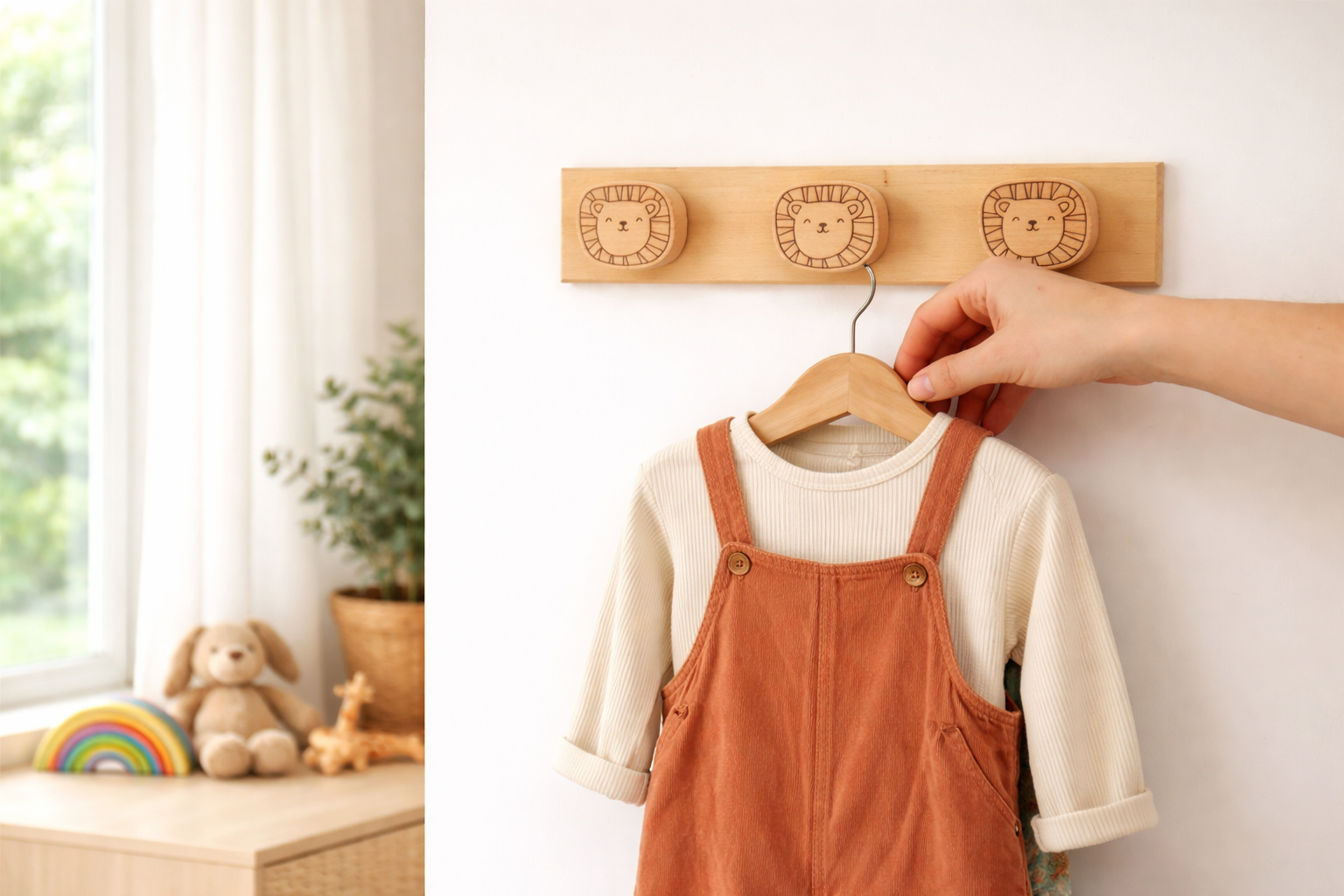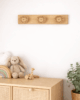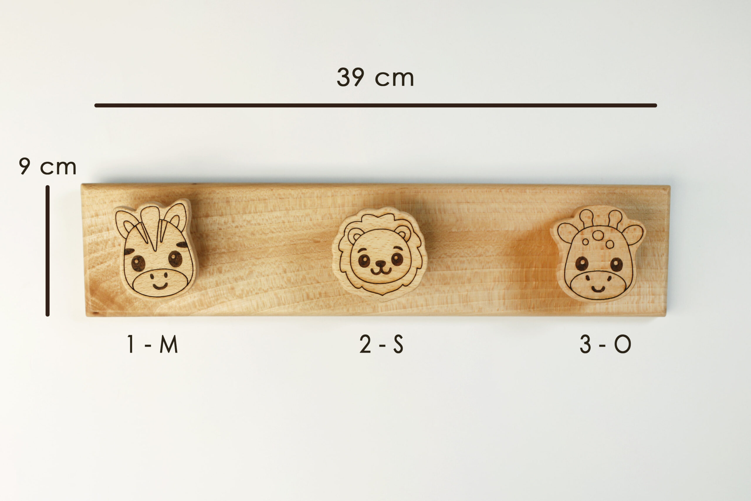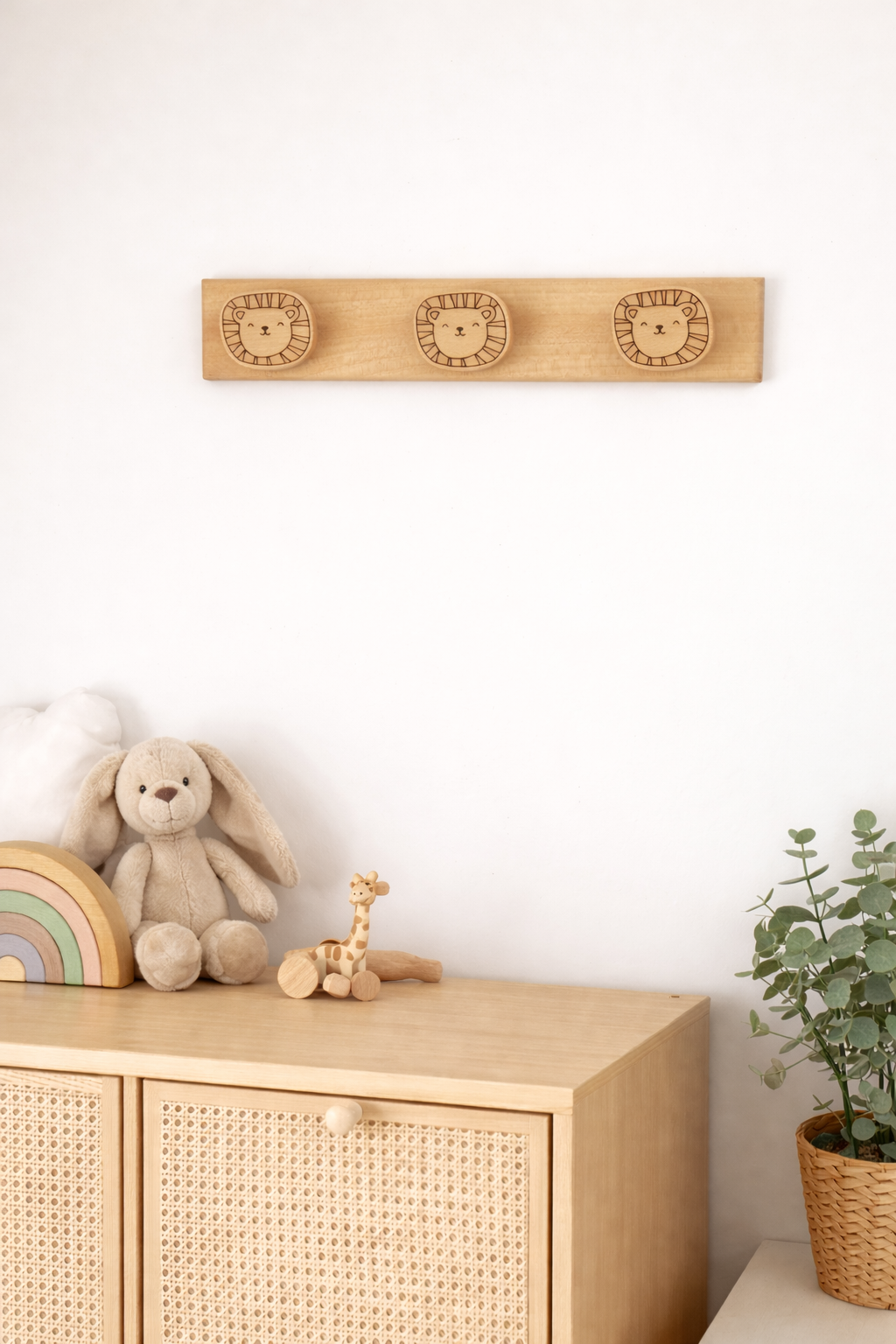 El perchero tiene tres asas decorativas que también sirven como ganchos para ropa, mochilas u otros accesorios infantiles.