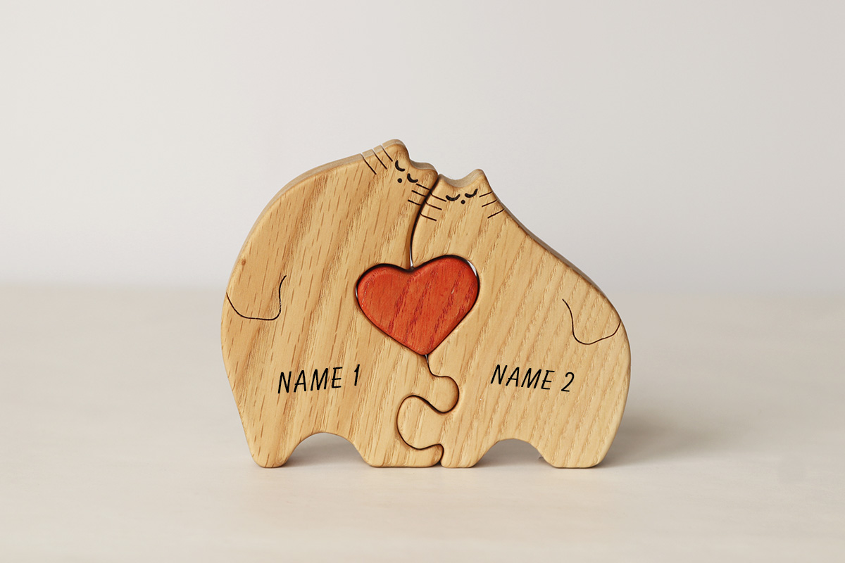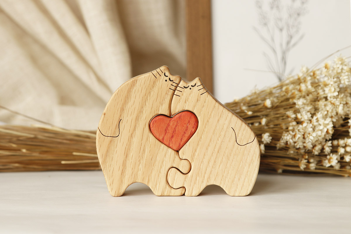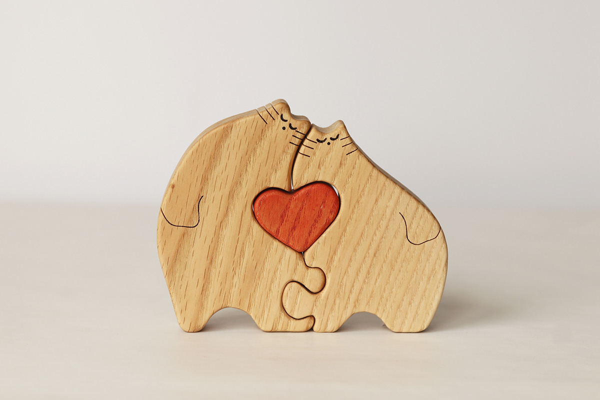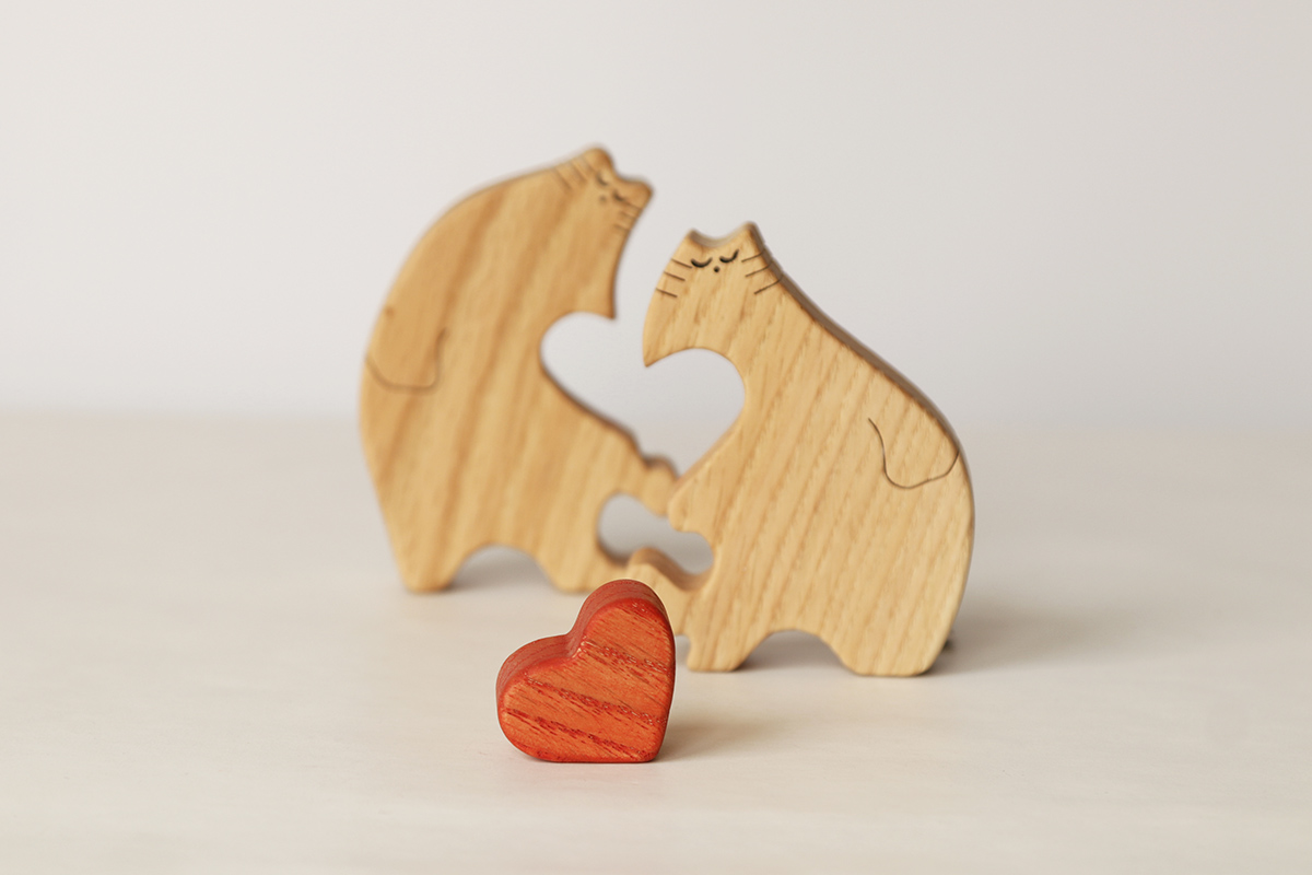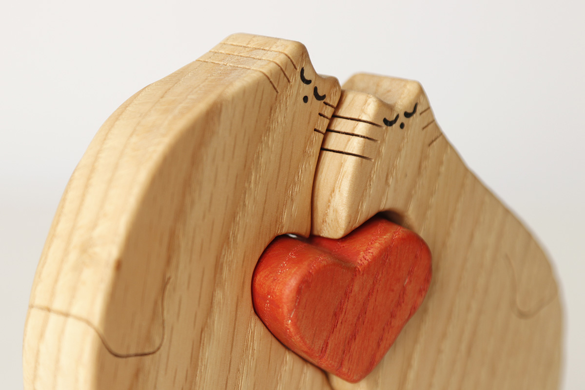 L'ensemble de figurines d'animaux symbolisant la famille est réalisé en chêne naturel. Les figurines sont entièrement réalisées à la main. Nous développons un croquis, le transférons sur la planche, scions, ponceons et appliquons un revêtement protecteur. Également sur demande, nous effectuons la personnalisation.