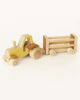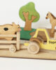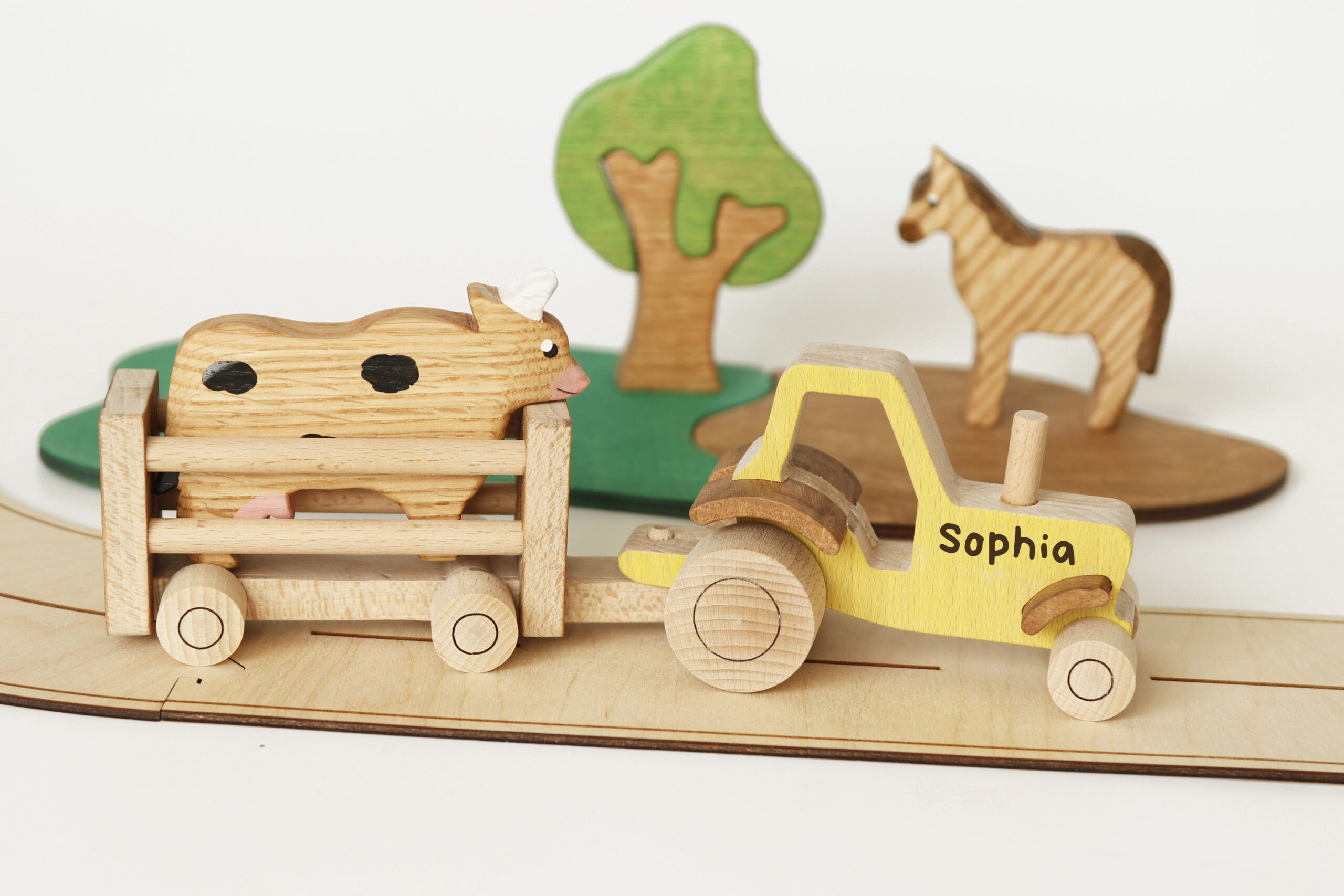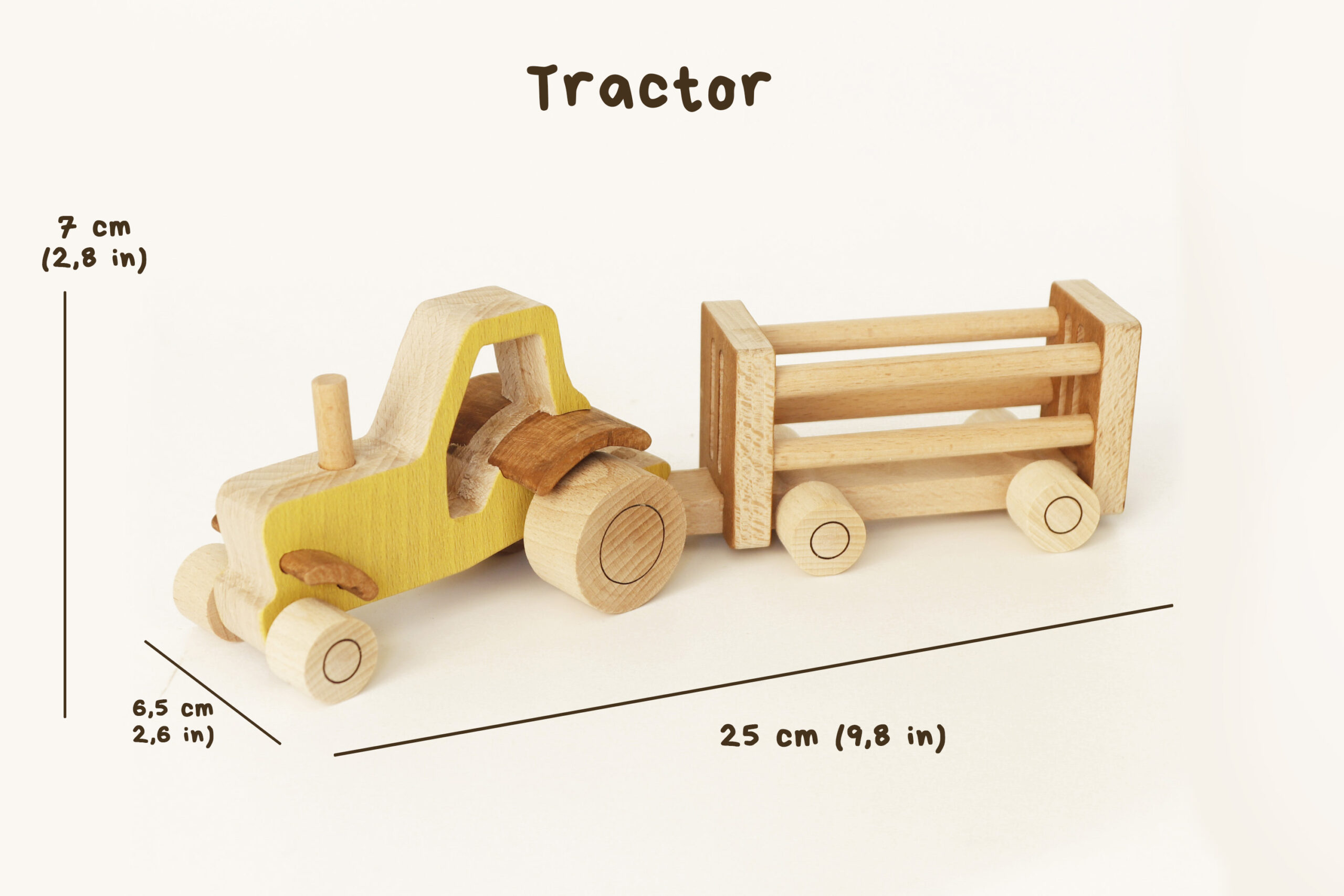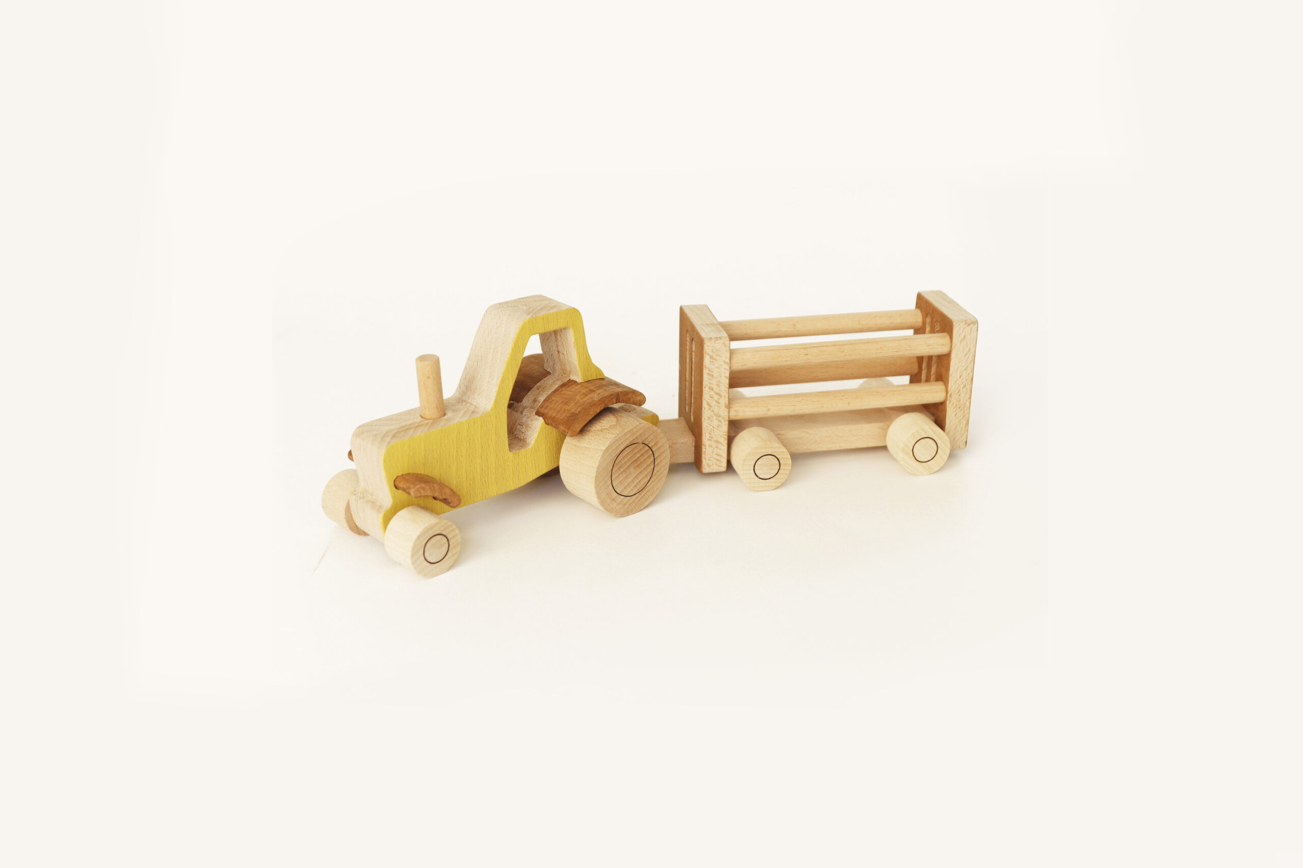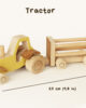Drewniana figurka traktora wykonana z litego drewna bukowego. Częściowo pokryta kolorowym woskiem, specjalnie opracowanym do zabawek dla dzieci.