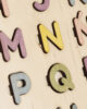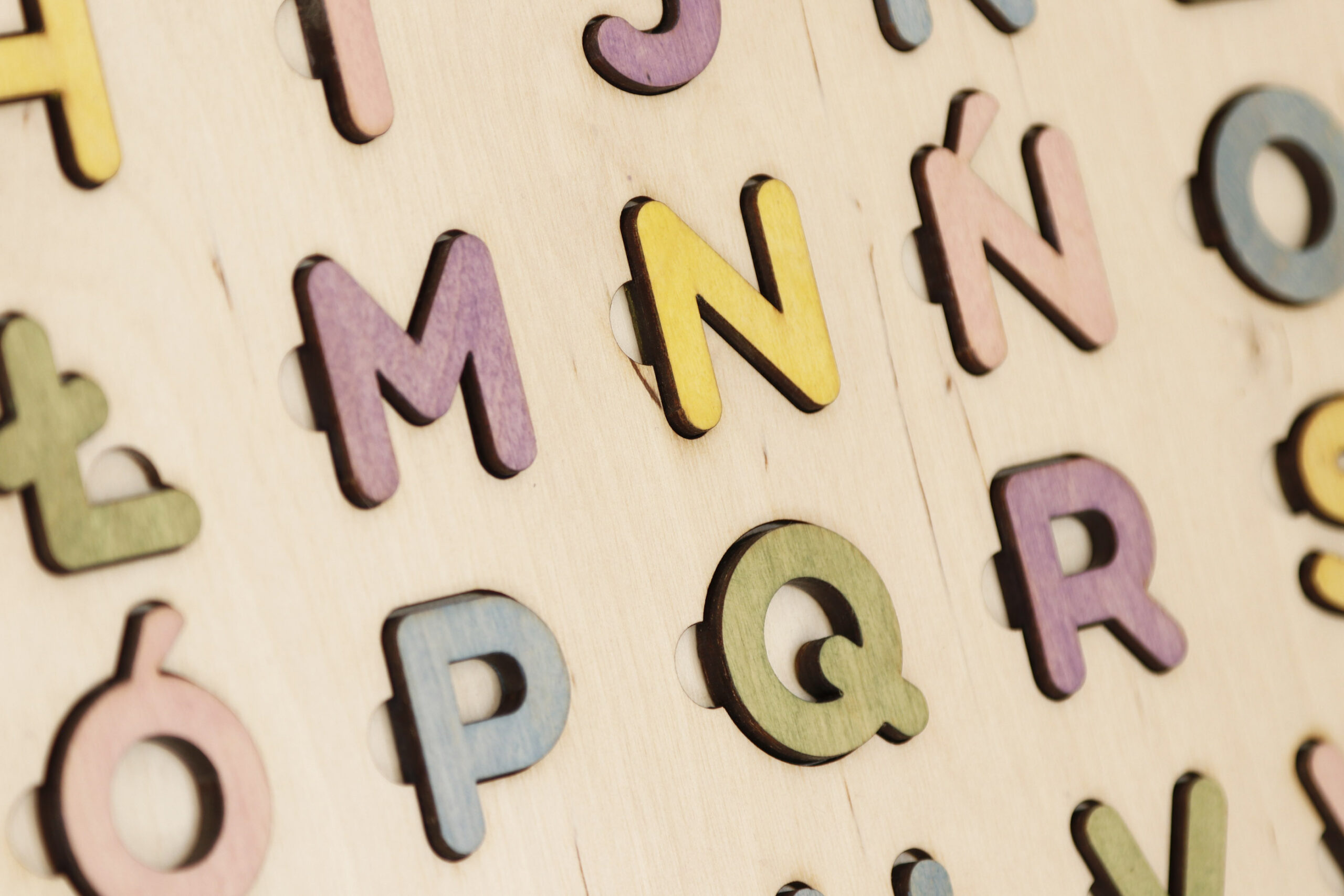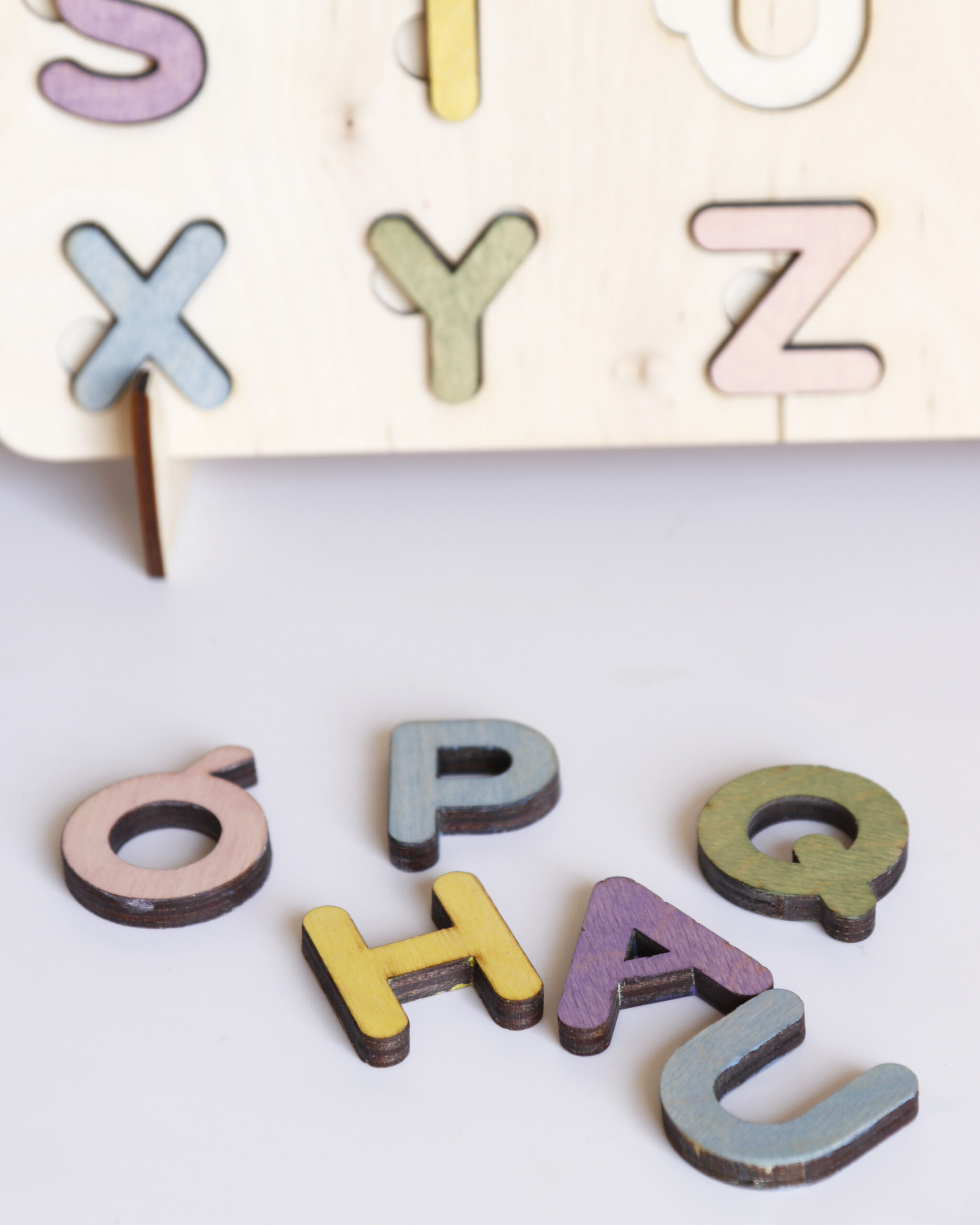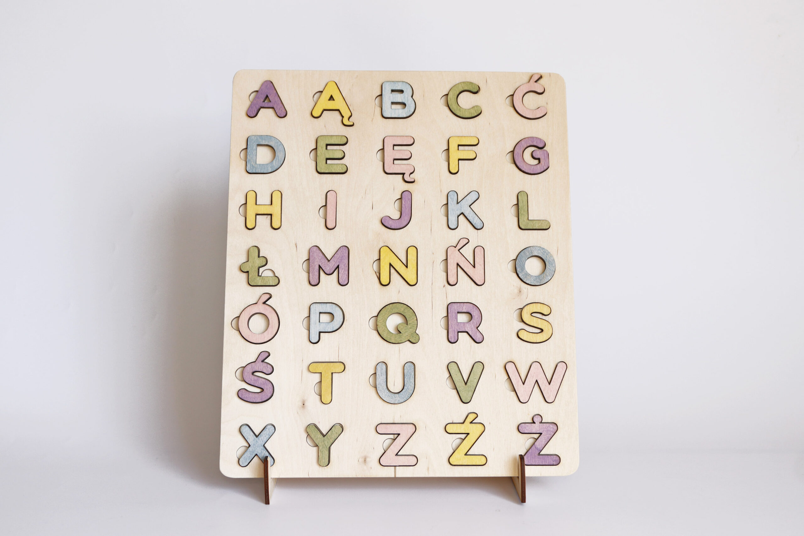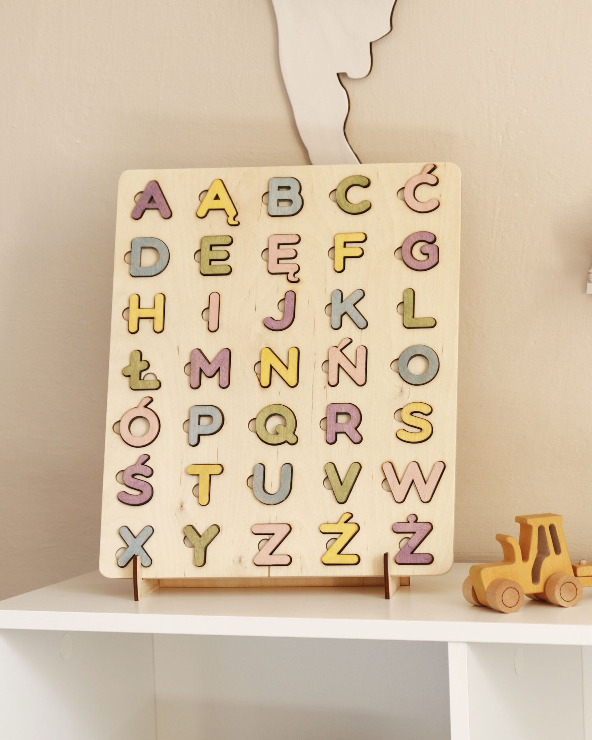 A wooden Polish alphabet puzzle made from plywood, designed to help children learn letters through play. The simple design and soft colors make it suitable for any child’s room. Each letter is a separate piece, easy for small hands to pick up and place.